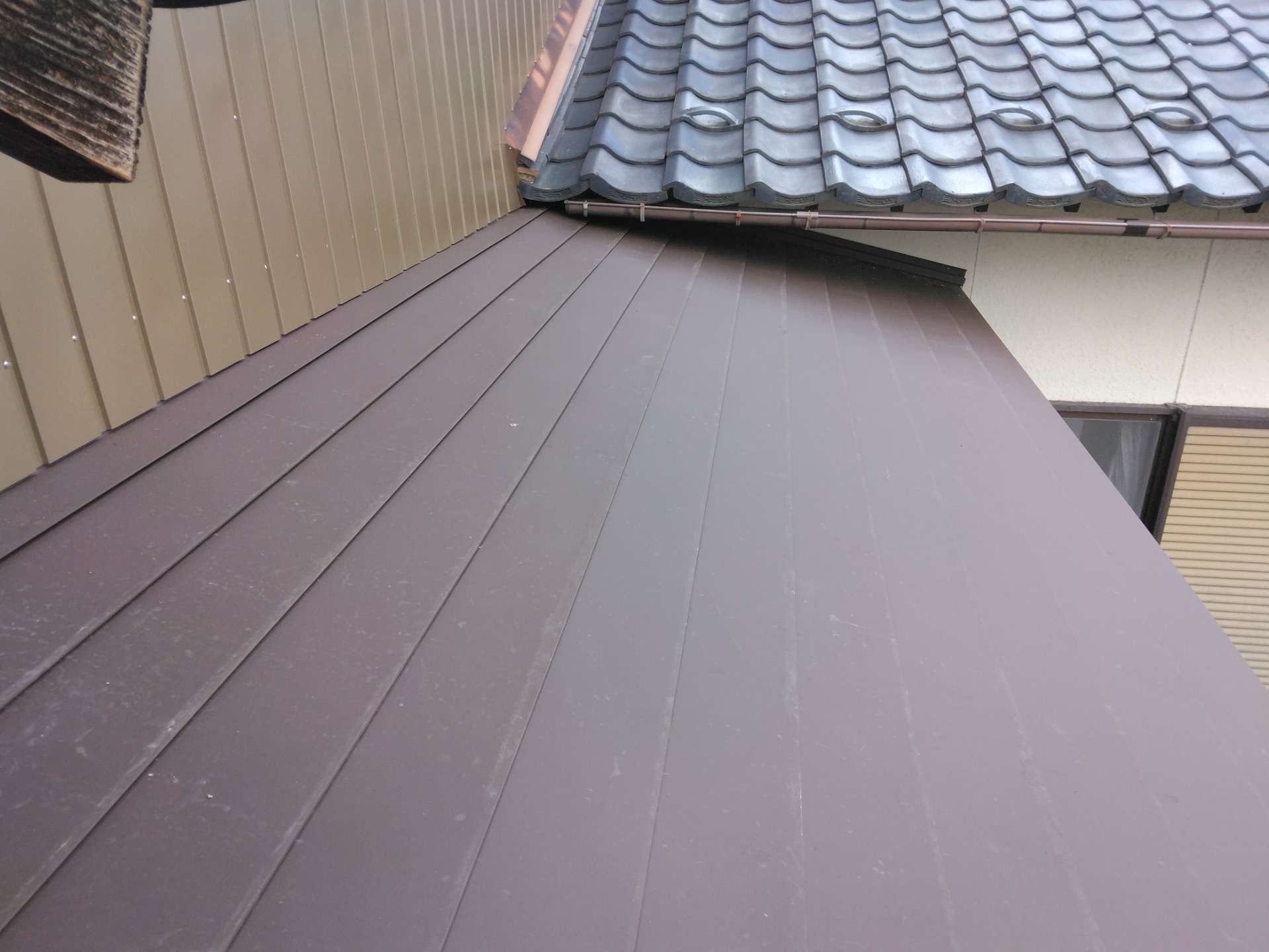 屋根材はAT式横葺き屋根、ガルバリウム鋼板0.35mm厚、綺麗に仕上がりました。